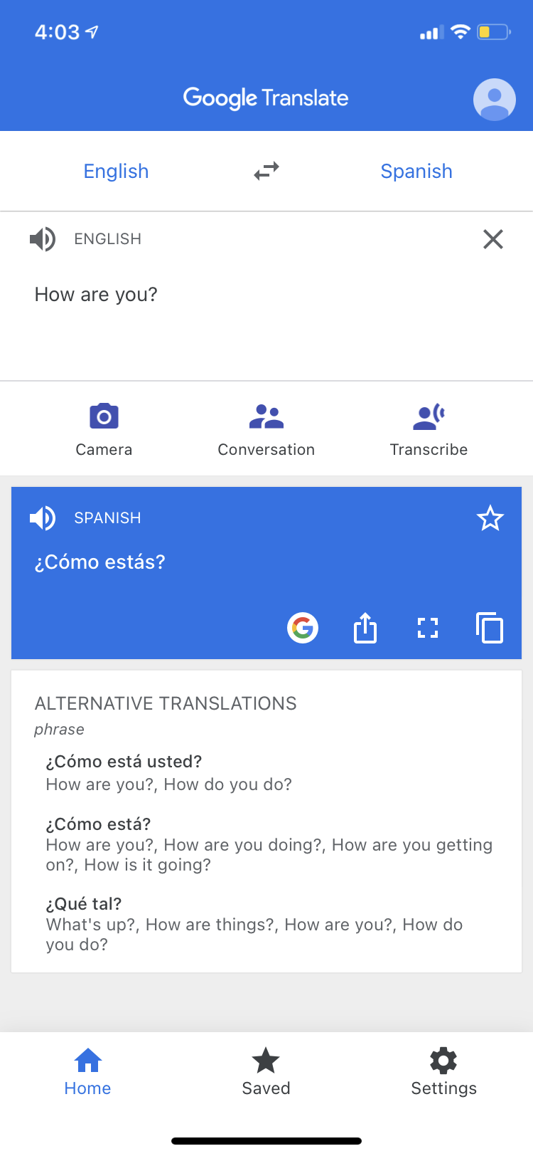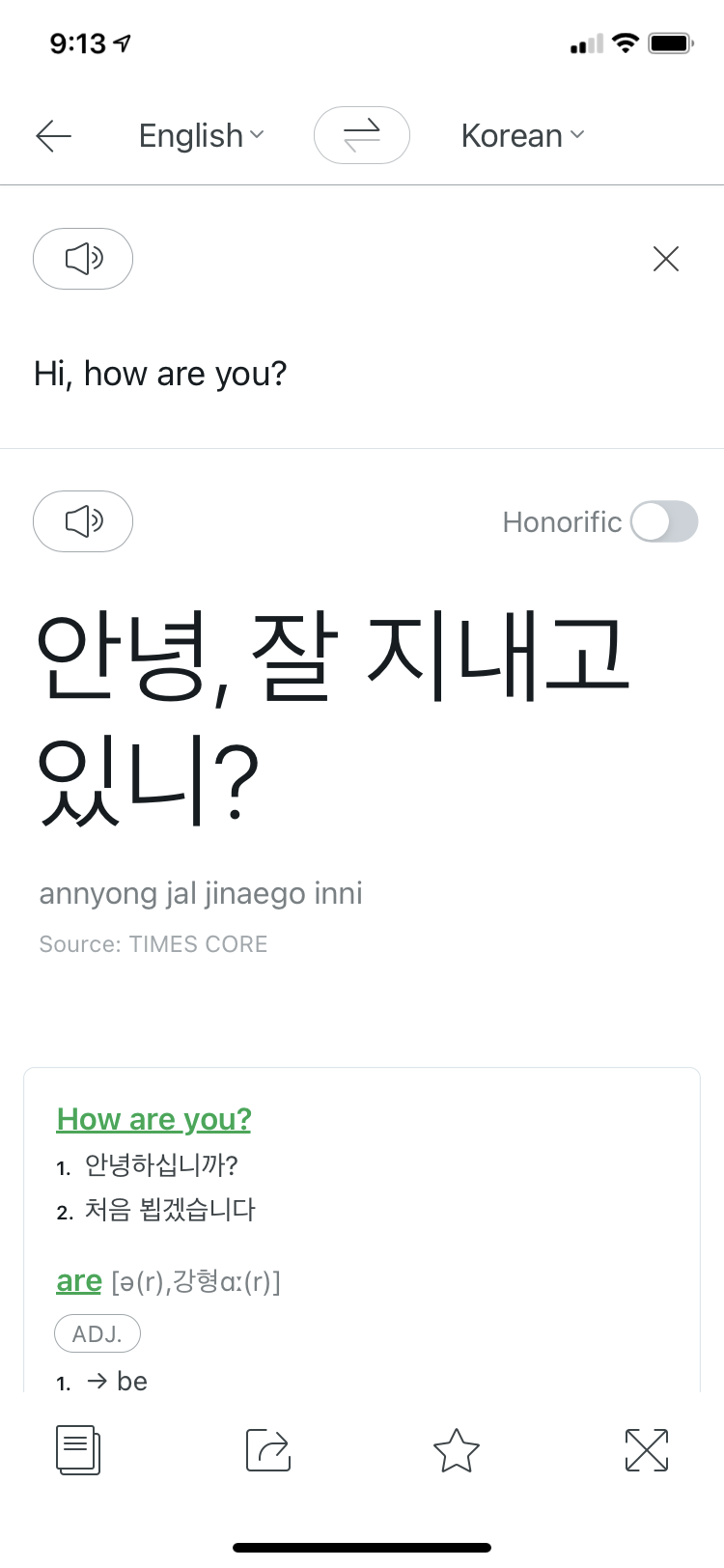 Once the automatic detection option is enabled, the Translate app can also be used in conversation mode. It detects the language spoken and automatically translates it to the other language. At the same time, it also transcribes the original and translated text on the screen. While the app can translate voice and text, it lacks the feature to translate text from images. Tap on the star icon after the translation to save it in the favorites tab for later usage.