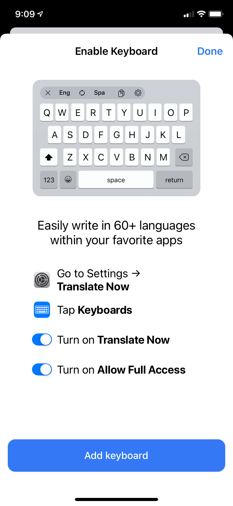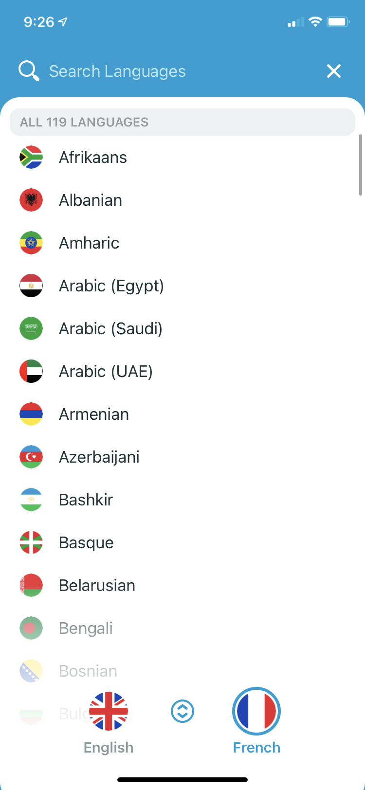 Translate Now app is exclusive to the Apple ecosystem. It is available for iPhone, iPad, Mac, and Apple Watch. Along with conventional translation features, the app also comes with a translator keyboard for quickly translating text even while using other apps. Out of the 110+ languages supported by the app, 73 of them can be downloaded for offline translation. The app shows the most recently used languages at the top of the list for quickly switching from one language to another.