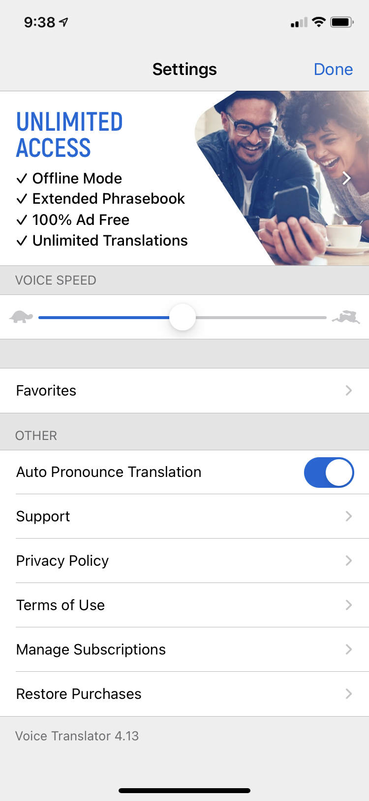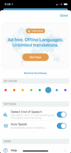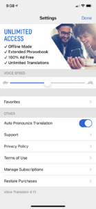 It also comes with an option to choose between male and female voices and the speed of the output voice. Also, there is a limit on the maximum number of transactions per day in the free plan. The premium subscription plan of the Speak and Translate app costs $5.99 per month or $69.99 per year. Surprisingly, there is a paid version of the same app listed on the Apple App Store for a one-time fee of $19.99. The paid Speak & Translate app gives full access to its service without any additional charges.