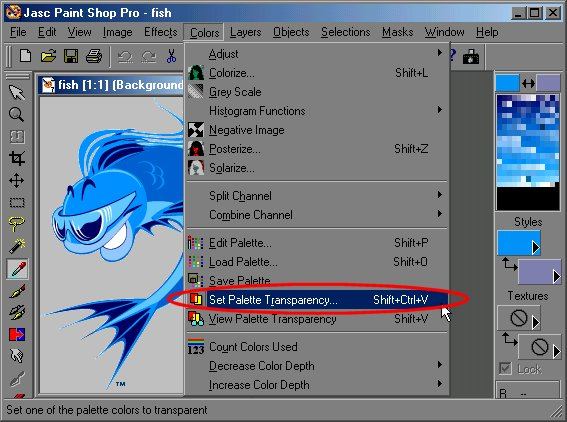 - Now, when you see the background colour appear in the background color palette as shown below, then you need to click on the colors tab and then go down to Set Palette Transparency as per your choice. Choose maximum for 100% background transparency.