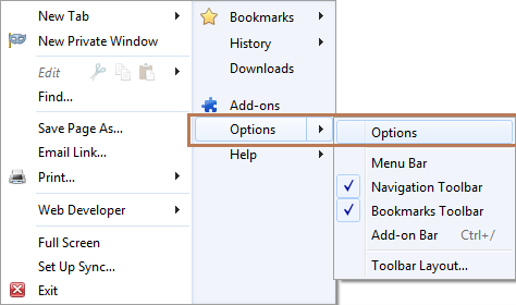 As this is mostly about playing around with the settings in the browser, here is how you can go to options. Go to Menu > Click on Options (or place the cursor over Options to open a sub menu, and click Options in that). This would be the same for all the different steps given below.