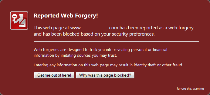 These are the two warnings that you would see when the malicious or forgery pages are browsed in Firefox.