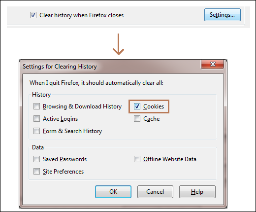 Cookies are something that the websites store, and there are websites which can function badly if you totally disable the cookies, “Clear history when Firefox closes” and click on “Settings” beside that option. It would open the Settings for Clearing History, where you need to select only “Cookies” and click on OK to save the setting.
