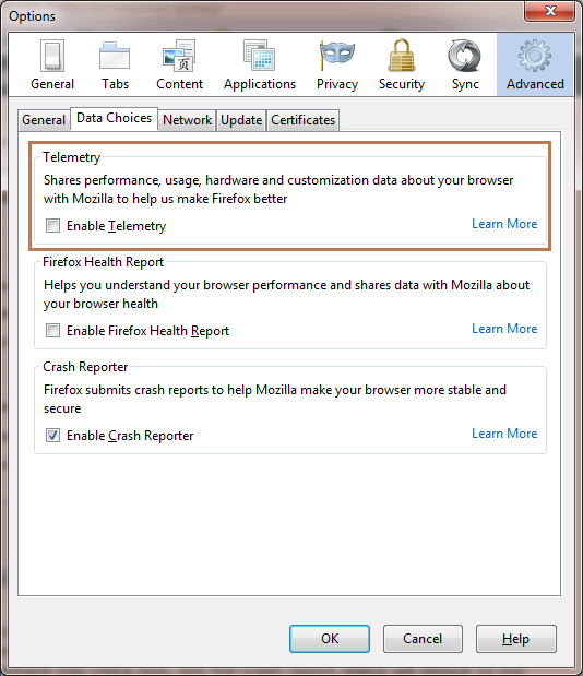 The Telemetry option shares the performance, usage, hardware and customization data about the browser with Mozilla, but that wouldn’t need your prompt any time and things would be running in the background. Uncheck the option so that no performance or browser / hardware data is sent to Mozilla.