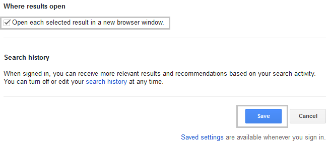 Tick the option “Open each selected result in a new browser window.” and then click on Save to save the setting.