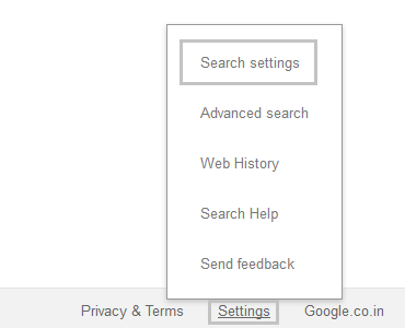 Go to Google.com and in the bottom of the home page, you will see a link “Settings”. Click on that, and a menu would open above it, where you need to open “Search settings”.